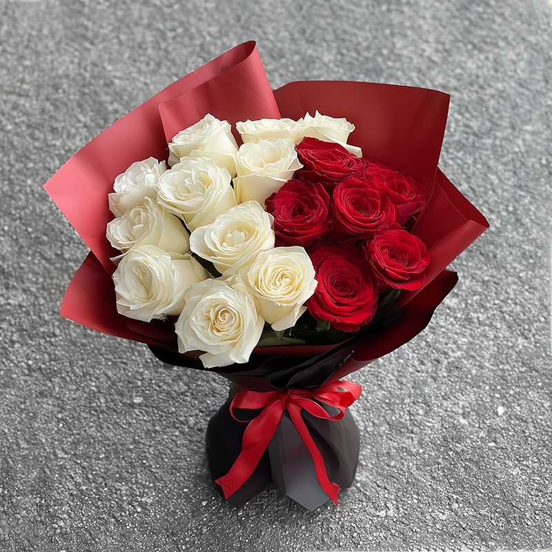 這束花束是一段編織著奉獻與純潔的浪漫敘事。白玫瑰如凝聚的月光,象徵純淨無瑕的愛;紅玫瑰猶如燃燒的烈焰,訴說熱情且真摯的情感。花束以神秘的紅黑色包裹,紅色緞帶如同旋律的點綴,共同譜寫愛的交響曲。每一片花瓣輕聲低語著深沉的思念與無盡的仰慕。