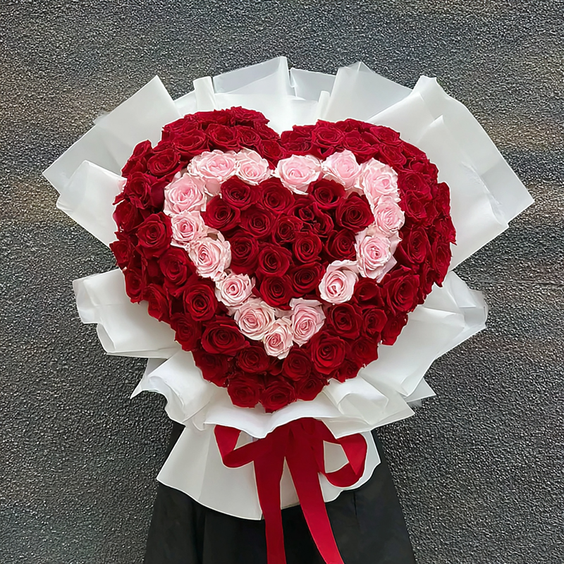 這束花是愛情具象化的詩意畫作。紅玫瑰如熾焰般灼熱燃燒,粉玫瑰則以柔嫩低語——共同勾勒出心形輪廓,彷彿所有愛意都已盛放成這心形花簇。純白包裝紙似雲朵織就的柔軟外衣,包裹著芬芳暖意,朱紅緞帶繫著深情結扣,靜靜宣告:「以心為箋,贈你整座浪漫宇宙。」